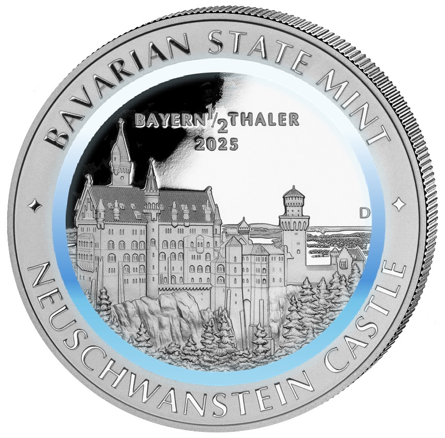 Der „Bayern Thaler“ ist eine moderne Neuinterpretation der historischen Münze „Thaler“, die bis zur Gründung des Deutschen Reiches im Jahr 1871 im Königreich Bayern als gesetzliches Zahlungsmittel im Umlauf war – unter anderem in Varianten wie dem „Geschichtsthaler“ oder dem „Vereinsthaler“. Als Motiv dient Schloss Neuschwanstein, das im 19. Jahrhundert von König Ludwig II., dem Enkel Ludwigs I. und Herausgeber der Geschichtsthaler, erbaut wurde. Das Schloss ist weltweit bekannt für seine märchenhafte Architektur und gilt als Wahrzeichen des Freistaats Bayern.